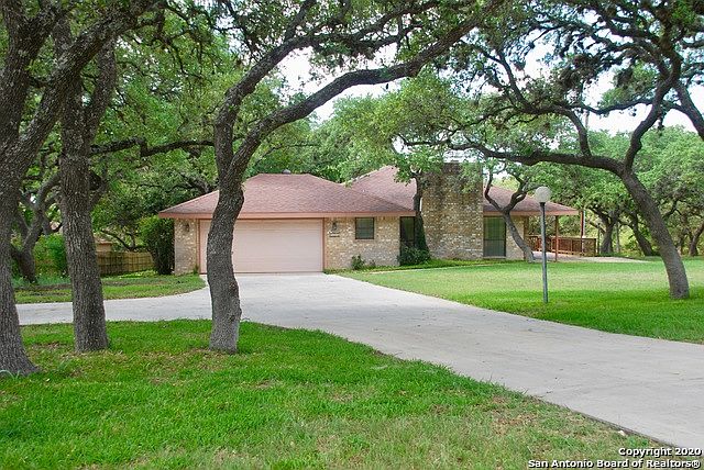 With room to roam or even build a second house, this 1.67+/- acres has options for everyone and anything. This beautiful single story ranch style home in "hill country" setting amongst the live oak trees on the north side of Canyon Lake. This 4 bedroom 2 1/2 bath brick home has 2414 sq. ft of living space and features a cozy den with fireplace off kitchen, vaulted ceilings in the living area, 2 breakfast areas and tile floors through out the entire house. A large wrap around porch provides a perfect place to relax overlooking the inviting in ground pool. The entire property includes 1.668 +/- acres with tons of mature oak trees for privacy and a large storage building that has utilities and overhead storage area with elevator. The central location with convenient amenities allows it to be used as primary residence or second home. Listing changed recently to add lot 2B, an additional .83 acres buildable lot.