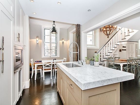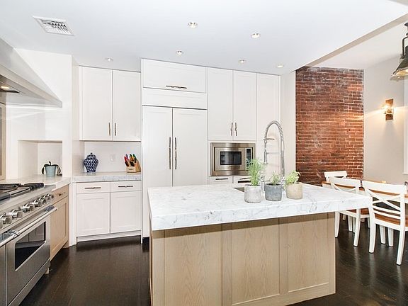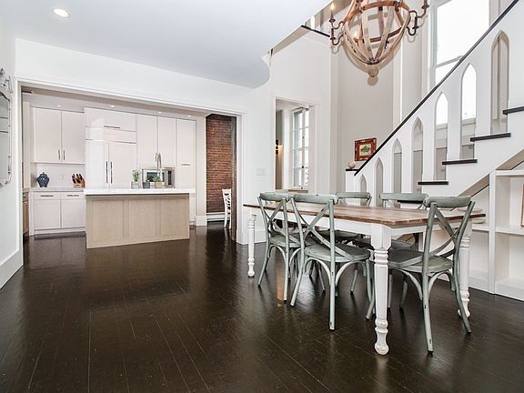 Spectacular bi-level Penthouse loft has been carved from a Victorian Gothic building, dating from the 1870s, with meticulous attention to architectural detail. Open concept floor plan offers a versatile sun-filled living area, with vaulted cathedral windows and ceilings, designer chandeliers, custom lighting, mahogany stained hardwood floors and entertainment wet bar. The stunning Chef’s kitchen features solid Carrera marble counters, customized cabinets, Viking Professional stainless steel "dual fuel" range and stove, Sub-zero refrigerator and wine cooler. A majestic staircase leads to the upper level’s generous primary bedroom, with skylight, and sumptuous spa style bath, with deep soaking tub, oversized walk-in shower, radiant floors. Two additional bedrooms and a second luxurious tile bath compliment this home. Located in the desirable North End neighborhood of Boston, this unique home also offers an amazing private roof deck retreat with expansive roof top and city skyline views.