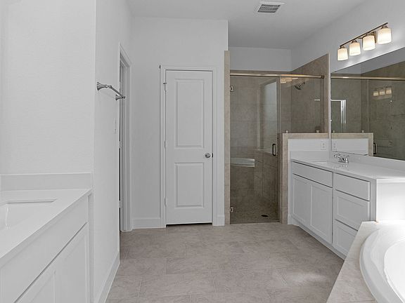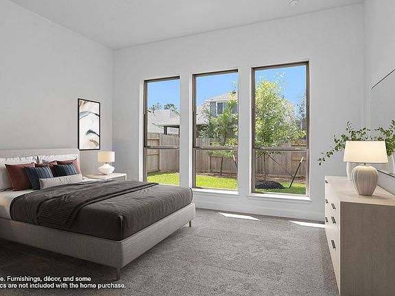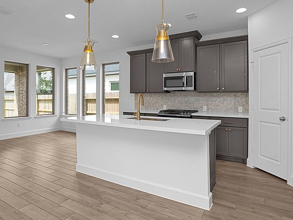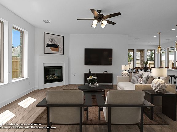 Front porch with two-story entry. Large family room with a cast stone fireplace and wall of windows. Home office with French door entry just off the family room. Island kitchen with built-in seating space and a corner walk-in pantry opens to the dining area. Secluded primary suite. Primary bath offers dual vanities, walk-in closet, a garden tub and a glass enclosed shower. Second level offers a large game room with a wall of windows, secondary bedrooms with walk-in closets, full bathroom and a linen closet. Covered backyard patio. Utility room just off two-car garage. Representative Images. Features and specifications may vary by community.