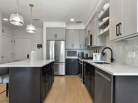 Welcome to this stunning Jeffries Point corner unit at Two Eight Seven! This spacious 2 Bed/2 Bath residence offers 1,027 sq ft in a desirable split floor plan, featuring large windows that showcase breathtaking views of the Boston skyline. Enjoy a seamless open kitchen/living/dining area perfect for entertaining. The primary bedroom features an en-suite bath with an oversized shower and a sizable walk-through closet. The modern kitchen boasts a quartz island, two-tone shaker cabinetry, and stainless-steel appliances. Beautiful Porcelanosa tile, matte black fixtures, and frameless glass showers adorn the bathrooms. Additional highlights include pre-finished hardwood floors, recessed lighting, and in-unit laundry. Residents enjoy top-notch amenities, including a fitness center with Echelon Bikes, garage parking, and more. Conveniently located less than 1/2 mile from Maverick T Station, airport shuttle, bus lines, and ferries to downtown and restaurants