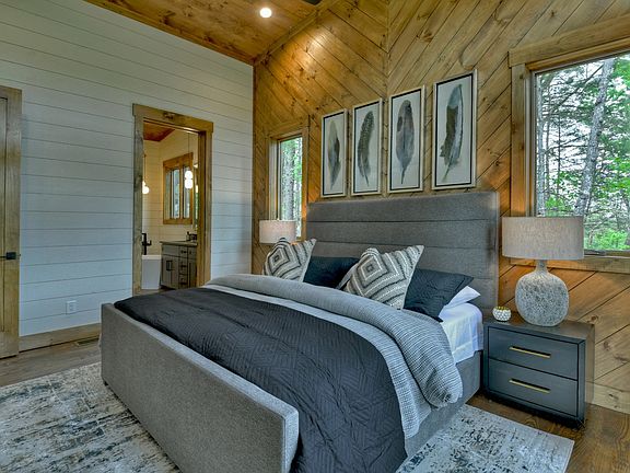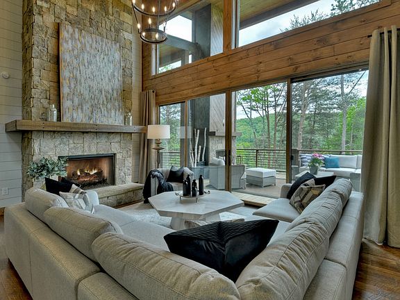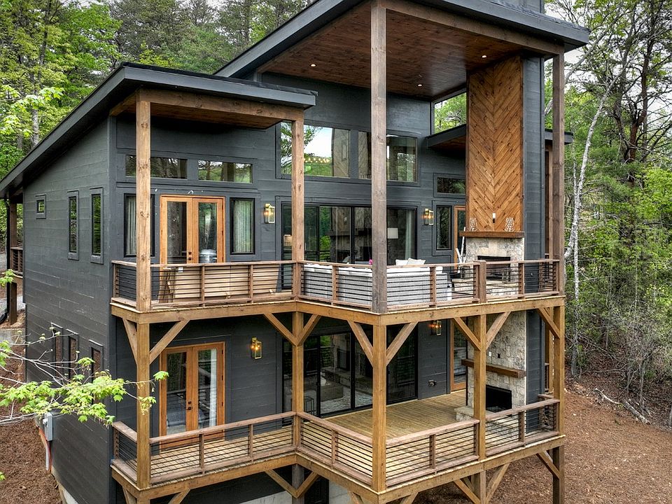 Refined Rustic Flair with Contemporary Lines & Modern Motif...this 4 bedroom/4.5 bath charmer is nestled on gentle wooded lot with long range mountain views ...warm wood finishes with light & bright layout, plentiful floor to ceiling glass & soaring ceilings, industrial and custom touches with massive stone fireplace in great room, sliders open to expansive party porch with outdoor fireplace, two spacious masters feature ensuite spa feel baths with eye catching tile, soaking tub & upscale fixtures, stainless appliances & granite waterfall counters, modern lighting & beam work enhance the flow of the cozy but open floorpan, full finished terrace level offers guest quarters, spacious den/rec room, bunk room, wet bar, storage & entertaining porch with addy'l fireplaces...uniquely inviting & just off paved, scenic road just LESS than one mile to historic downtown...this is one you'll want to see! Turnkey fully finished is an option!