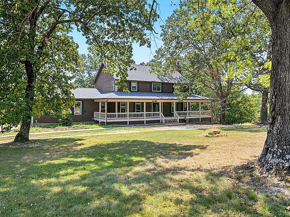 Escape to your private retreat in this jaw-dropping 5-bedroom, 4.5-bathroom 2-story cabin in the woods. This property boasts approximately 4,400 square feet of living area, has almost 8.45 acres, and offers ample space to roam. With two primary suites, this home is built for entertainment or accommodating the biggest of extended families! Its 2nd floor features the first of two primary suites (including its bath, dual vanities, jetted tub, walk-in shower, and primary closet), reading room, two guest bedrooms, and an additional guest bathroom. The main level features a formal dining room, eat-in kitchen, utility room, walk-in pantry, and a large living area complete with fireplace! Downstairs you'll find the second primary suite (including its bath, dual + make-up vanities, and walk-in shower), non-conforming guest bedroom + bath, second living area (with fireplace), and washer/dryer hookups in a utility closet. There's storage everywhere in this home! Step out onto the expansive main-level wraparound porch (screened-in around the back) and enjoy nature's serene atmosphere. If you're a green thumb, the downstairs sunroom is right up your alley! Let's not forget the family animals - there is even a fenced in spot for them enjoy their best life! Nestled on a quiet, dead-end road in a peaceful neighborhood, this property provides an ultimate escape. With an attached oversized 2-car garage, circular driveway, and plenty of outdoor space, it's perfect for those who seek picturesque comfort and adventure. Don't miss out on this rare opportunity to own your dream cabin! Seller is offering $15,000 seller concessions that can be used for new flooring, closing costs or rate buy down!