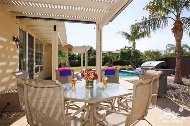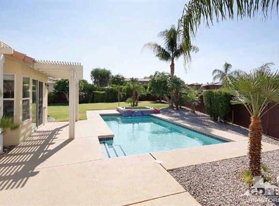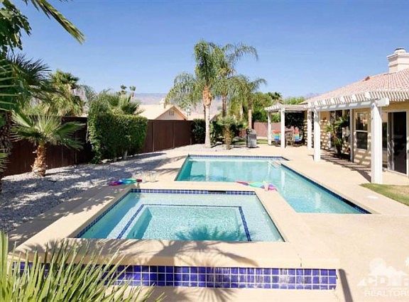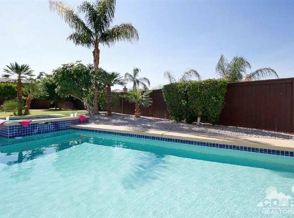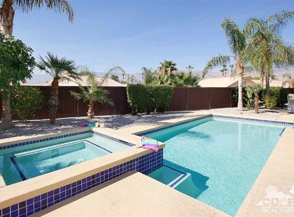 This home features a premium corner location with southern views in the gated community of Merano. The over-sized yard included an impressive pool/spa, and tons of space for family fun or entertaining. Offering 3 bedrooms, a den and 2 baths, this home is perfect to enjoy either your primary or desert vacation home. Stepping inside you find features that include large tile floors in the great room and family room and a cozy double-sided fireplace. The adjacent kitchen area is open to the nearby dining area and offers open views of the pool and patio areas. The master suite opens to the pool area and features abundant natural lighting and handsome master bath with dual sinks and shower/tub combo. The guest rooms and den are just the right sizes. The gated community of Merano is close to shopping including a Bristol Farms market that's walking distance, dining, shopping and lots of fun activities.