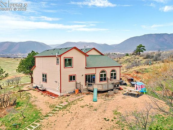 If you are looking for country living close to the city, do not miss this one!!!This amazing property sits on 5.14 acres and offers panoramic views! Forest Lakes & Cheyenne Mountain to the south & the Front Range to the west and city lights to the east! This foothills home offers full southern exposure and is the location you have been waiting for! Watch the sunrise and sunset from the new deck will be under construction soon! Move-in ready family home offers 5 bedrooms, 4 baths, 4,088 sq ft & a 3.5 car garage. Zoned for horses & no HOA. The covered front entry welcomes you into the bright foyer w/hardwood floors & coat closet. The iron stair railing was custom crafted by a local Monument metalworks artist and reflects Aspen bark and America's Mountain. Beautifully updated kitchen offers granite counters, stainless appliances with an induction cook-top, copper sink overlooking a view of the Front Range, & an enviable walk-in 8x4 pantry enclosed w/double sliding barn doors. Central air conditioning recently installed! The main level offers a formal living room w/mountain views, formal dining room w/peeks of the lake, breakfast nook, family room with vaulted ceilings, powder room, and tidy mudroom off the garage entrance. The upstairs master suite offers mountain & lake views, and a luxurious master bath w/a clawfoot tub, double vanity, separate shower, water closet, and spacious 8x5 walk-in closet. Also on the second level, you will find 3 additional bedrooms, a linen closet, and a charming bunkhouse themed hall bath with a sliding barn door to separate the dual vanities. The finished basement offers a 2nd family room, a game room/gym, a 5th bedroom with an updated en-suite ¾ bath, and 5 storage spaces. Enjoy 5.14 acres of your own private world complete with a barn, fenced garden, RV parking, paved asphalt driveway, deck, & mature trees which create a feeling of seclusion and privacy. Easy commute via I-25 to the Air Force Academy, Colorado Springs, or Denver.