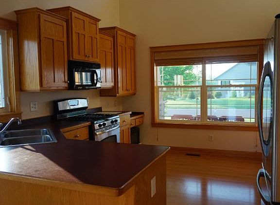 Just perfect! This absolutely charming rambler offers 2 bedrooms, 1 bathroom, new carpet & laminate flooring, ceramic in foyer &bath, main floor laundry, fresh paint, fabulous eat-in kitchen complete withcraftsman style cabinetry, stainless appliances, stunning vaults, double hung windows,master walk-thru bathw/whirlpool tub & separate shower, w-in closet in master, security system &one will sure love the welcomingfront porch! The walk-out lower level has an abundance of future space!Beautiful landscape with sprinkler system, paver patio and retaining walls all nestled up against relaxing views. The home is very well placed in a family friendly neighborhood offering sidewalks, parks & all amenities near by!A one year home warranty is also included with this home!