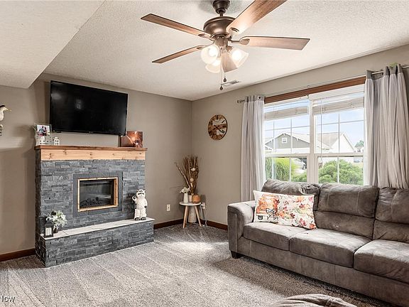 Inside, you’ll find three spacious bedrooms and two full baths upstairs, including a serene primary suite with a walk-in closet and private bath designed for comfort and retreat. The main floor features an open-concept kitchen with rich custom cabinetry, a large island perfect for gathering, and sleek stainless-steel appliances—all flowing effortlessly into a welcoming living room with a cozy fireplace.