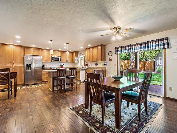 This single-level home is a true gem, offering an oversized 2-car garage with work bench PLUS a detached 35 x 14 ft. shop/RV garage that is equipped with power and an RV dump, providing ample space for your hobbies and vehicles. Inside, the home boasts an open floor plan, upgraded laminate flooring, and a recently updated kitchen featuring granite counters, abundant wood cabinetry, and a large island—an ideal gathering spot for family and friends. The comfortable living area welcomes you with a vaulted ceiling and a cozy gas fireplace. The primary suite is generously sized with 2 closet spaces, and a large shower. Outside, relax under the private covered patio while enjoying the mature landscaping, including privacy fencing, and garden boxes, creating a tranquil retreat. Additional highlights include indoor utility room with washer & dryer, a new roof, and a newer water heater. Located in a desirable East Medford neighborhood, this home offers plenty of comfort and convenience.