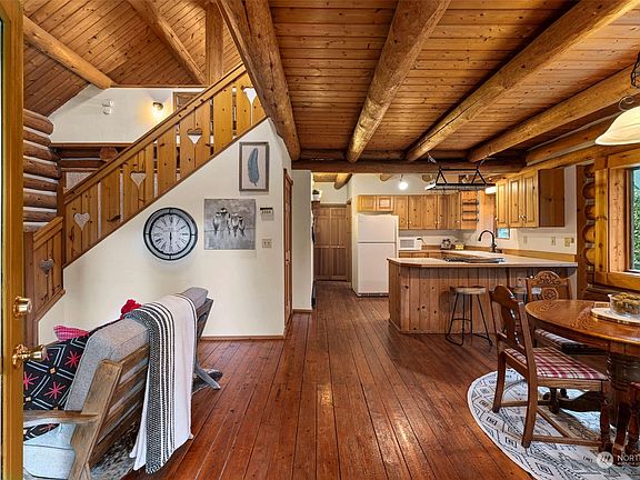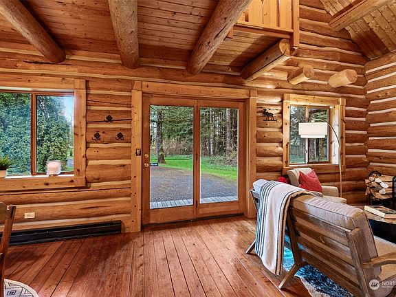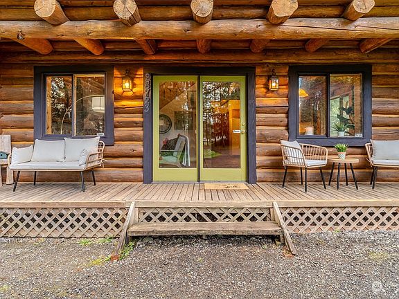Discover your woodland retreat with this charming log home and guest cottage nestled on nearly 5 acres of lush forest. Explore winding trails that extend into adjoining acreage, offering access to 160 acres of DNR forest. The 1,320 sq ft Bavarian-style log home boasts a cozy wood-burning stove, Douglas fir floors, and a second-story veranda. Across the privacy hedge, the 788 sq ft guest cottage features a sleeping loft, antique wood stove, and kitchenette overlooking the flower garden. Entertain outdoors with a jetted hot tub, fire pits, and a bountiful berry patch and enjoy this tranquil oasis surrounded by a thriving forest ecosystem teeming with wildlife. Just over 1 mile to amenities. Total Bed and Bath include Log home and ADU.