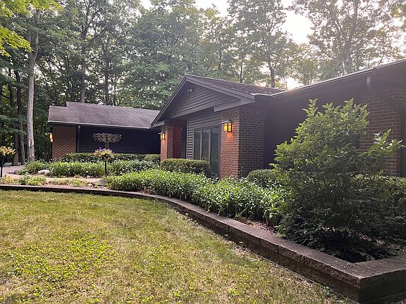 This is a one of a kind home designed by Russell Francois with many Frank Lloyd Wright touches, including the replica doors that greet you as a come into the home. A brick and cedar 3180 sq ft ranch with a three car garage, Pella windows and 9 foot ceilings, setting in beautiful timber. A generous foyer greets you with much wall space and open shelves with track lighting to showcase your treasures. The foyer opens into a beautiful living room with a flat wall gas fireplace. which was previously a woodburning fireplace but has had the gas insert added. Beautiful Canadian maple hardwood throughout the main living area and halls. Off the living room you can enjoy evenings on your screened porch and experience nature at its finest. Kitchen has stunning custom made black cabinetry, and a full wall of upper and lower cabinets for additional pantry wall storage. A built in desk, double oven stove and corian countertops finish the beautiful styling. Sliding glass doors lead to a concrete raised deck with brick walls to replace railings. A formal dining room with recessed lighting, trayed ceiling and accent columns make for a lovely presentation for your dinner guests. Move on down the track lit wide hallway, past a delightful decorated half bath, and find a large family room with much daylight streaming in, large enough to have a pool table along with seating and a large screen tv. Follow the wide hallway to the north end of the home where you will find three bedrooms and a hall bath. The hall bath was recently updated with a vessel sink, new beautiful tile flooring and a newly tiled shower/tub combo. Be sure to see the gorgeous sliding doors on the tub. Two guest bedrooms look out to the front of the home with large windows to enjoy the seasons. A large primary awaits down a generous hall, with sliding doors to your own private screened in porch with a leisurely porch swing for quiet evenings. Off the primary is a private bathroom with new walk in shower, and a large closet finishes off this en suite. Your three car heated garage offers much shelving and work area with storage, a wall of organized hanging for tools, and an entrance to the basement. The 790 square foot basement has an egress and is a perfect shop or craft room. Outside you will find an abundance of timber with a peaceful little creek winding its way through. An additional 768 sq ft garage with concrete floor was added in 2016 and is just a short distance down a gravel path from the home. Grow your own vegetables and even some strawberries in your enclosed garden! This is a fantastic home on a total of 10.85 acres, close to Moraine View State Park and in the award winning Tri Valley School District. An absolutely stunning home that will make you feel like you have come home to your own private vacation destination every day!