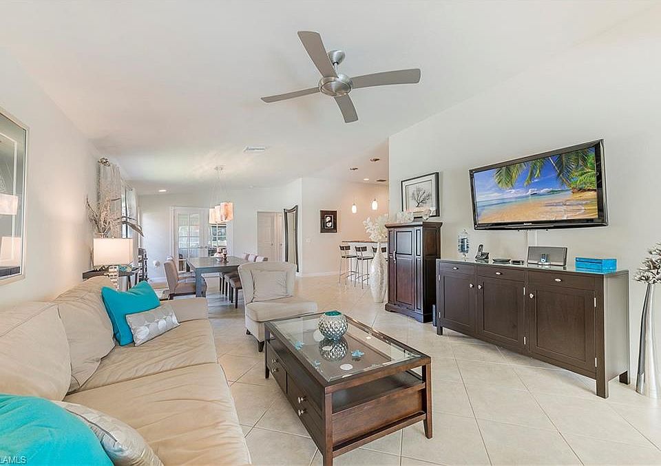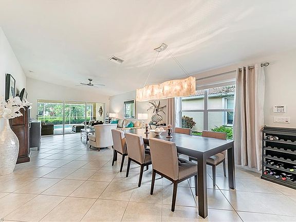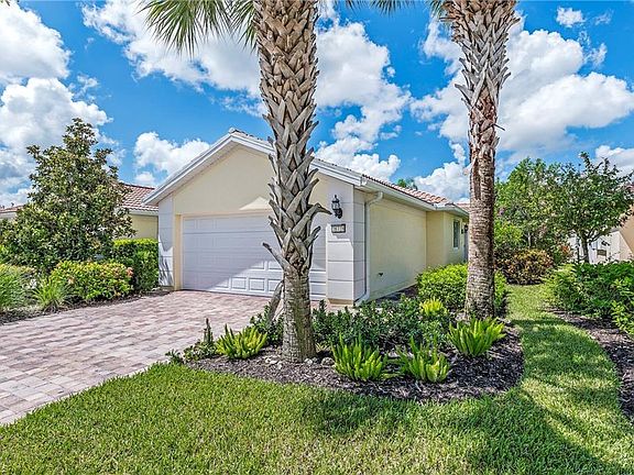 H.1624-Just bring your toothbrush! This rarely available Carrington is beautifully appointed and comes fully furnished with top quality furniture and everything you need to move in. Tile on the diagonal highlights the living, dining, and the third bedroom areas. Custom white fabric panels can be hung around the entire lanai for a private spa like feel. The third bedroom can double as a den or study. Fully outfitted for cooking in the beautiful stainless and granite kitchen. Linens and towels for bedrooms and bathrooms are included. High-end light fixtures and ceiling fans highlight the rooms. The lanai has a storm screen so your outdoor furniture can be stored under cover when you are ready to leave town. This split bedroom layout is ideal for guests/family with bedrooms and baths separated. The quiet cul-de-sac offers easy access to the river walk system that leads to the Town Center area where you can grab dinner, get your hair done, or meet for a game of pickle ball, tennis or workout in the gym. The 22 miles of walkways and pedestrian bridges make Villagewalk an easily walkable community where you can enjoy the scenic lakes and beautiful vistas. New A/C 2018.