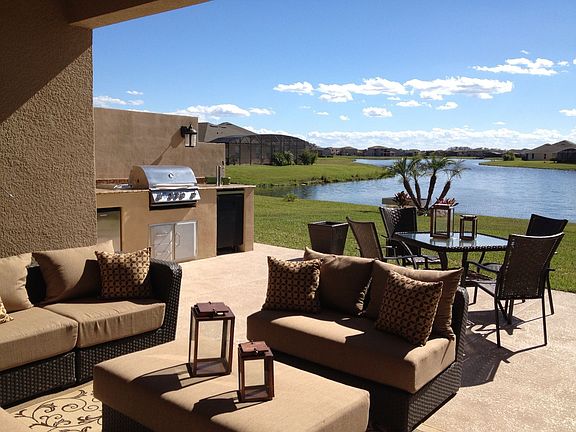 Gorgeous Park Square home, almost 2,900 ft. heated. True 4/3, with an office den, all on 1 level. Pristine waterfront frontage in rear, includes boat dock and has direct access to Lake Toho! Upgrades included quality flooring, Porceain Wood Look Tile and ceramic tile, through much of home! Nice electric fireplace in living room, quality crown molding throughout and more! Awesome 3-way split plan, HUGE Master bedroom, 4th bedroom in rear of home, ideal for relatives guest quarter, an older child or an exercise room. Gorgeous kitchen including 42"cabinets, nice Corian countertops, kitchen island and more. Appliances include COMMERCIAL ,convection and nice Stainless Steel appliances. Spacious office/den in addition to the 4 true bedrooms. Spacious Master bath includes mirrored dressing area, garden tub and more! Dual closets in Master Bedroom, including 1 huge walk-in! Impressive cut-out or trey ceilings in various locations. Outside is paradise! Quality waterfront views, spacious covered and entertainment area, Nice summer kitchen, ideal for entertaining and grilling. Also, includes customized beer tap ! Inside laundry room has nice tile flooring, and significant cabinet space. This home has it all! Impressive and tremendous value is an understatement!