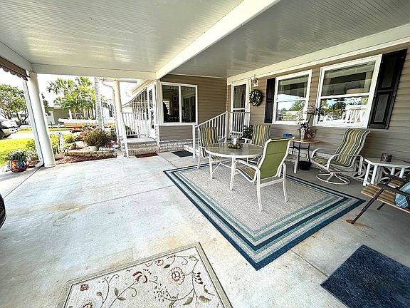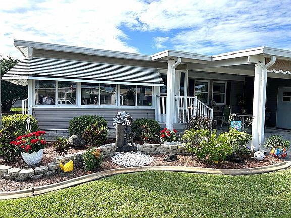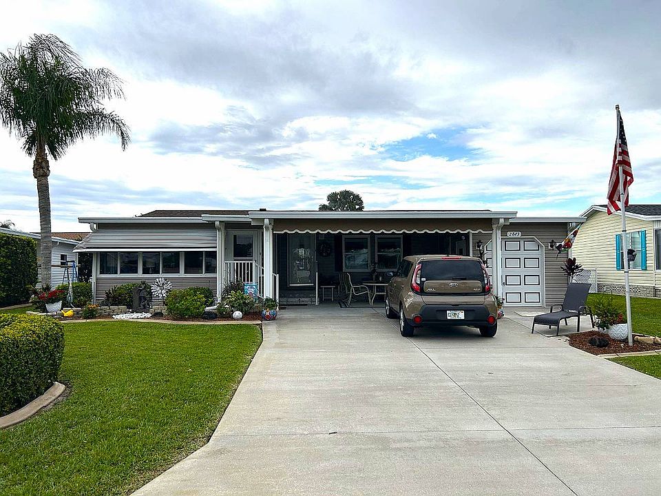 2006 3 BR 2 BA 1344 SQ. FT. Completely and beautifully furnished and turnkey, split floor plan, loads of built in storage!!! New thermopane windows, laminate floors throughout, new irrigation pump, Crown Molding, Inside laundry with extra storage, beautiful landscaping, Double carport, large storage shed, Windowed and AC in Florida room, New roof in 2023, Golf cart included with new batteries.