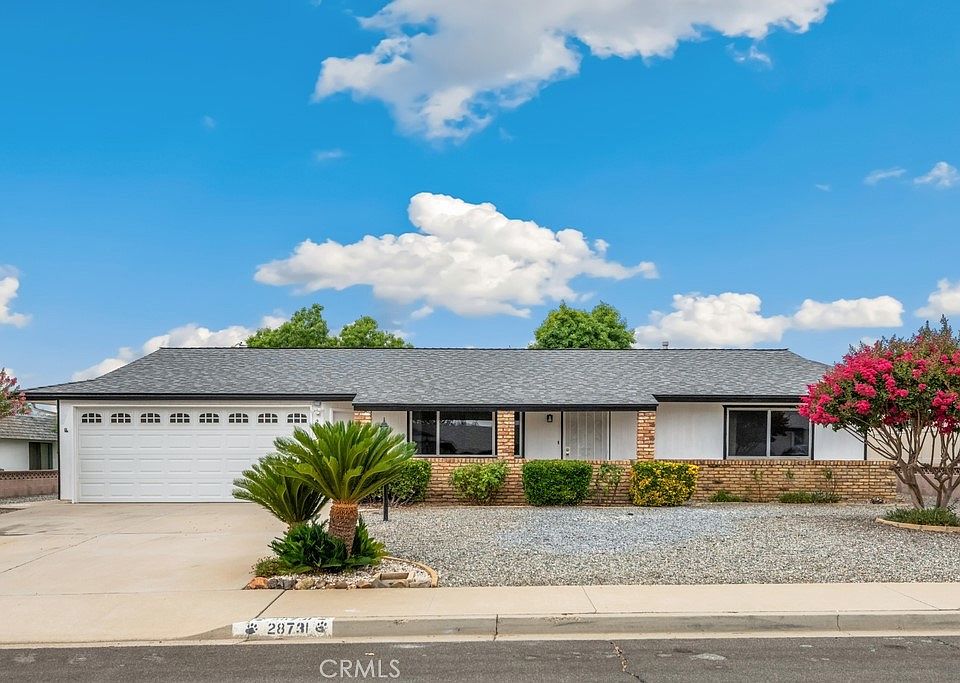 Move in ready single level home located in the desirable 55+ Community at Sun City! Offering great curb appeal with easy, low maintenance landscaping/rockscape a spacious floor plan with wood flooring, a bonus room, and an attached 2-car garage! Enjoy the covered porch before entering the home where you are greeted with an abundance of natural light in the living room with ceiling fan. The living room flows into the dining area which sits just off of the kitchen with wood cabinetry and laundry room with extra storage space. The bonus room sits just past the kitchen and dining area and has a ceiling fan, a sliding glass door to the backyard and a side door. There are 2 generously sized bedrooms, the massive primary suite offers a private bathroom with shower and there is also a hall bathroom for the secondary bedroom and guests to share. Enjoy the large private backyard with pergola to relax under as well as well manicured landscaping/rockscape - this is the perfect space for relaxing or entertaining guests. Residents also get to enjoy community amenities including swimming pools, a tennis court, rec room, and more! Conveniently located not far from shopping, dining, and the 215 Fwy. Schedule your private tour today!