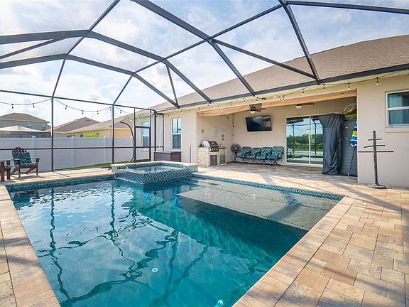 Gorgeous and spacious 4 bedroom/3 bath pool home in the gated Creeks Crossing community in North Lakeland - conveniently located between Tampa and Orlando and close to I-4, shopping, dining, entertainment, world-renowned parks and all that charming Lakeland has to offer! The home has an impressive foyer that opens to a large living room with built-in shelving and is flanked by a formal dining room and an office/den/library. There are high ceilings throughout. The kitchen has granite counters, a breakfast bar, stainless steel appliances, and plentiful tall bright cabinets. The primary bedroom has tray ceilings, an en-suite bath with a garden tub, huge shower, double sinks, and a water closet; a large walk-in closet, and sliders to the pool area. The additional 3 bedrooms are on the opposite side of the house, and bedroom #2 has an en-suite bath with a shower and pool access. The home is built for entertaining and fun, it is fully fenced with a large covered lanai and screened heated, beautifully tiled salt water pool with an infiniti spa, cafe lights, outdoor grill and refrigerator. Picture yourself enjoying the Florida lifestyle from your pool while gazing at the pond and wildlife. Call today for your showing of this dream home!