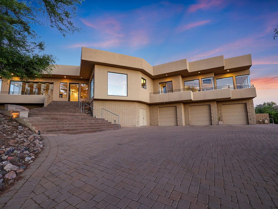 This entertainer's dream home has floor to ceiling windows inviting natural light throughout the entire house, a large living room with bar area & pass through window to the back patio, formal dining room and cozy sitting/piano room with accordion style windows to take in the colorful Arizona sunsets! Enter your chef's kitchen with a large island, gas stovetop, wine cooler, wall oven, high end stainless steel appliances, and gorgeous granite countertops. Venture out to your resort style backyard to relax by the oversized 2 level pool with 110 ft lazy river & heated spa. Enjoy panoramic views fireside around your raised built in firepit looking over the mountains and city lights.