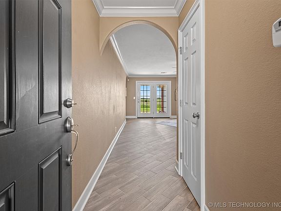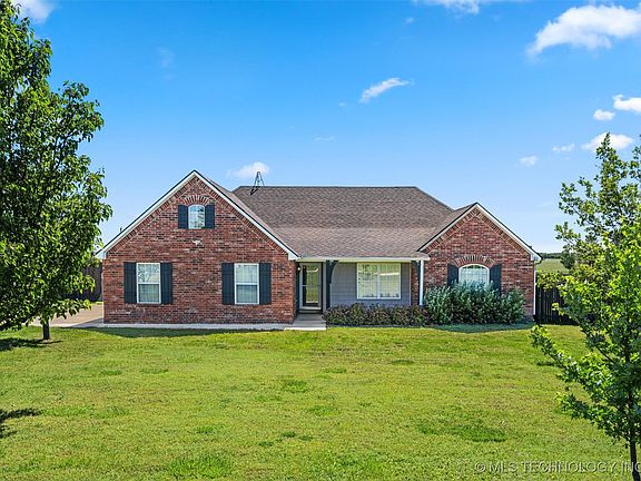 Move-in ready, meticulously maintained 4-bedroom brick home on just over 3.5 acres just south of Bartlesville. This single-level home sits on a quiet dead-end street in a country neighborhood with acreage lots. Perfect for livestock, gardening, or outdoor hobbies. The home features a Class 4 impact-resistant roof (2019), waterproof woodgrain flooring (2018), upgraded light fixtures and dimmer switches (2018), vaulted ceilings, granite counters, and newer appliances. The spacious kitchen/dining area includes 6-person bar seating and ample space for gatherings. The master suite offers a large jacuzzi tub, double sinks, and a walk-in closet. Oversized insulated 3-car garage with storm safe room, covered front and back porches, generator-ready setup, and partial fencing. The backyard includes a storage shed, chicken coop, and garden with views of a neighboring 100-acre ranch.