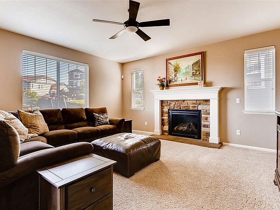 Beautiful Richmond home with finished basement, covered rear patio, tile roof, nice size yard. 3 bedrooms, 2 baths upstairs w/ laundry room. Main level w/ 5" maple hardwood floors, kitchen w/ granite and island, office w/ french doors. Great room w/ gas fireplace, large windows. Basement level has two bedrooms, full bath, and a family room. Honeywell alarm system w/ motion sensors; ethernet; Smart Thermostat w/ remote sensors. A/C, sprinkler system, green space behind rear yard. Close to I-25 for commuters! HOA includes access to The Grange and The Taft House pools!