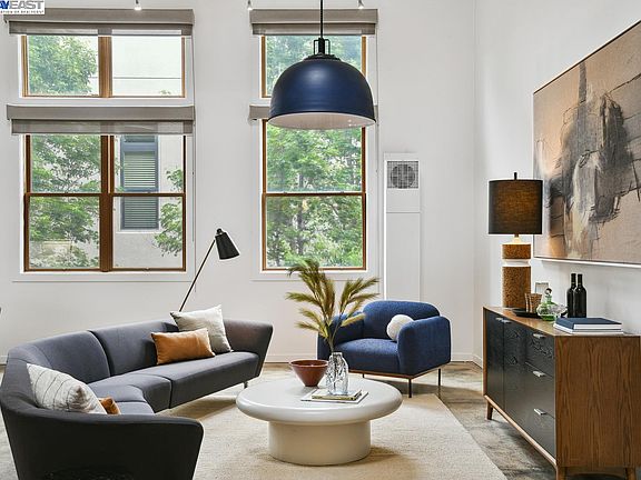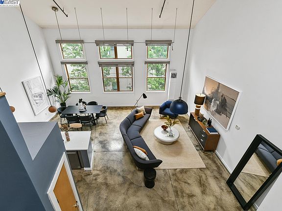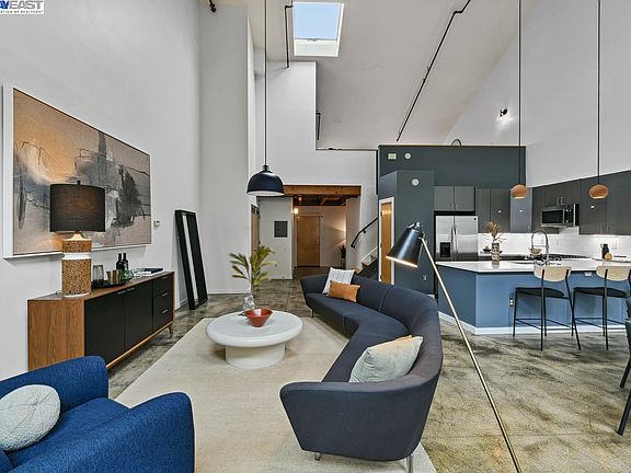 Incredible volume and beautiful, light bright finishes will make you stop and stare. This loft style living has extraordinary sophistication while being effortlessly cool! Contemporary design meets optimal functionality and impressive presence. Filled with light, the towering ceilings evoke grand volume and abundant space. The newly remodeled kitchen beckons entertainment and convenience that is clean, modern, and efficient. Abundant cabinets, quartz counters, and designer clay pendants are simply stunning. Warm wood ceilings and floors are a striking contract with the polished concrete floors. Wake up to a beautiful bridge view from the large primary bedroom suite. It is spacious and inviting with plenty of room for a king-sized bed and sitting area with abundant windows and bright beautiful light. A generous second bedroom is lovely; the space, plentiful. The bathrooms are stylish and have all the space you desire. Located in a relaxed neighborhood of coffee houses and Art Galleries. Serene waterside walkability, along with Park Street's bustling retail, make this convenient location one of the very hottest areas to call home.
