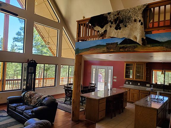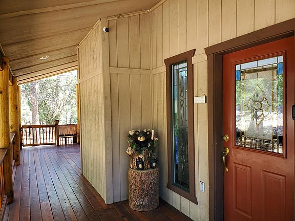 Fabulous Chalet Home with huge windows looking into the tall Pines. Open Greatroom with stained glass in the entry windows, wood floors and wood burning fireplace. Spacious Kitchen with 2 huge breakfast bars with granite countertops. Pantry and doggie door to either dog run or garden. 1/2 Bath and Utility room w sink. Master Suite is on the main floor w walk-in closet and separate double shower and jetted tub. Loft TV room with propane fireplace to snuggle up with a good book or office or whatever you decide. 2 very large Bedrooms upstairs and 3/4 bath with double sinks. 24x32 Garage with loft room. Also a huge shed for ATV or storage. All on one Acre in the Pines. See ''More''