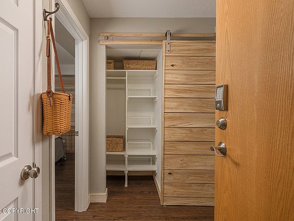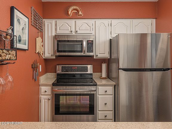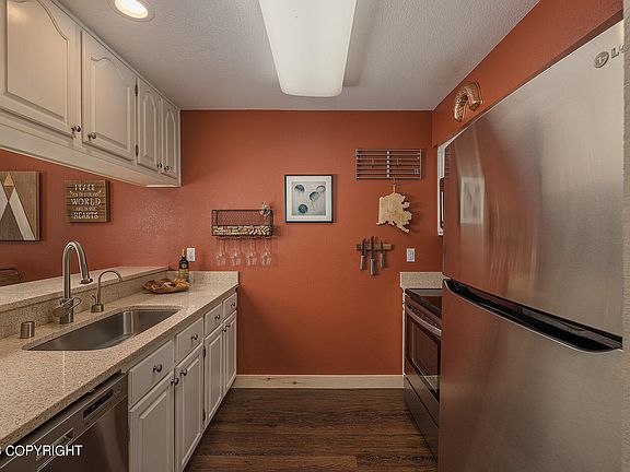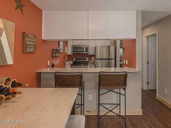 Impeccably maintained ground floor condo with a heated garage just minutes from the airport! Triple pane sound proof windows and sliding glass door make it very quiet and heat efficient. Kitchen features solid surface counter tops and stainless steel appliances, and living room has fireplace for cozy winter months. Large primary bedroom has Alaska birch wood details and accent wall.Lovely bathroom features include river rock vessel sink on soapstone-topped vanity, large soaking bathtub, tile with rock inlay accents. Luxury waterproof vinyl plank flooring throughout. Private patio and hammock area opens to beautifully landscaped courtyard.