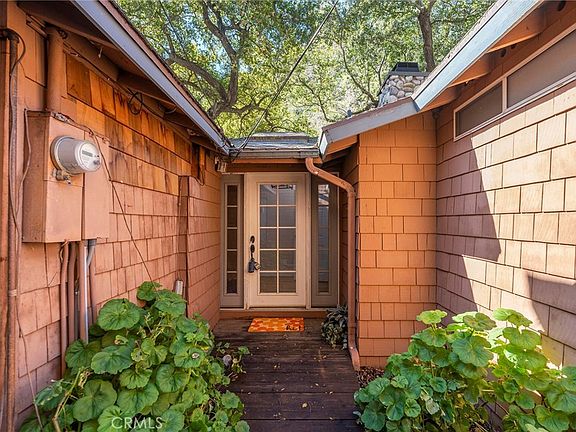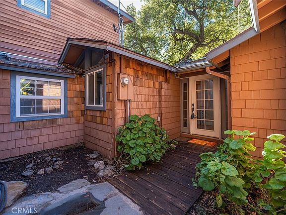 Embrace the tranquil surroundings of this charming rustic cabin, surrounded by mature trees and boasting endless useful spaces. Ascend the stairs to a stunning two-level studio apartment, complete with a remodeled bathroom, kitchen, and abundant character. Attached to the studio is a one-car garage, perfect for storage. Take a stroll down the steps to the front yard and enter the private entryway, where stunning skylights provide breathtaking views of the tree canopy. The formal living room, likely the original one-room cabin, reflects the seasonal cabins that were once common in the early 1900s. Look closely at the river rock fireplace for seashells that tell the story of Orange County's natural history.