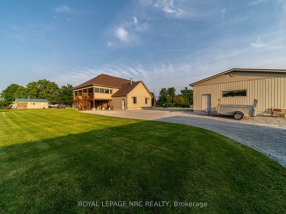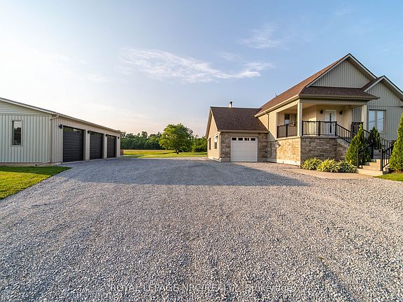 You will love this custom-built raised bungalow on a private 1-acre lot, complete with a massive 36'11" x 24'8" triple garage. Designed for both comfort and functionality, the open-concept main floor features vaulted smooth ceilings and a walk-out to a 30'3" x 13'4" covered deck - perfect for taking in the peaceful, natural surroundings.The primary suite offers a walk-in closet and ensuite bath. Downstairs, you'll find a third bedroom, den, rec room, full bath, and a walk-up to a second garage with 10' ceilings and a second kitchen, ideal for multi-generational living or hobby use. Out back, enjoy a 32' x 14' rear deck with direct access to scenic walking trails. The property includes a 48' x 8' unit and a 30' x 8' mobile unit on wheels, a septic system, cistern, and a 6' x 30' dug well for backup water supply. A John Deere riding mower is also included. Backed by untouched nature, this is a rare opportunity to own a versatile estate that blends lifestyle, privacy, and function.