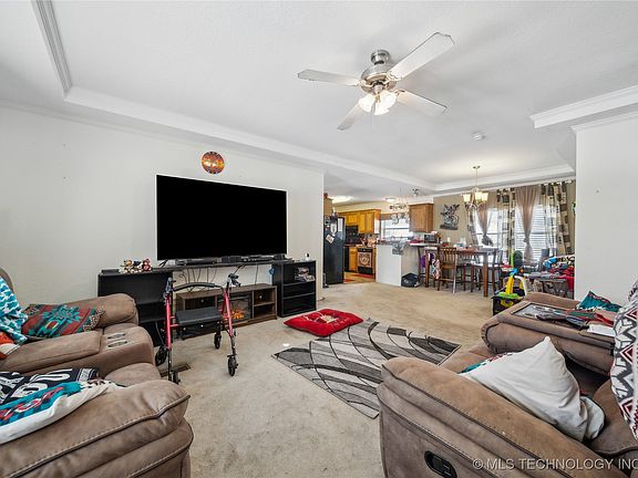 This listing features 1.5 acres of cleared land, perfect for a shop, along with a modern manufactured home built in 2016. The property includes two sheds, an underground storm shelter, and is adorned with mature trees, producing pecan trees, and blackberry bushes. The home boasts an open-concept design with spacious bedrooms and two full bathrooms. Conveniently located in Coweta, you'll find easy access to the turnpike, the Rose District, and downtown Coweta, all while enjoying the tranquility of wonderful, quiet neighbors. The home also comes with a refrigerator for added convenience.