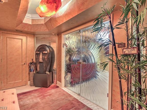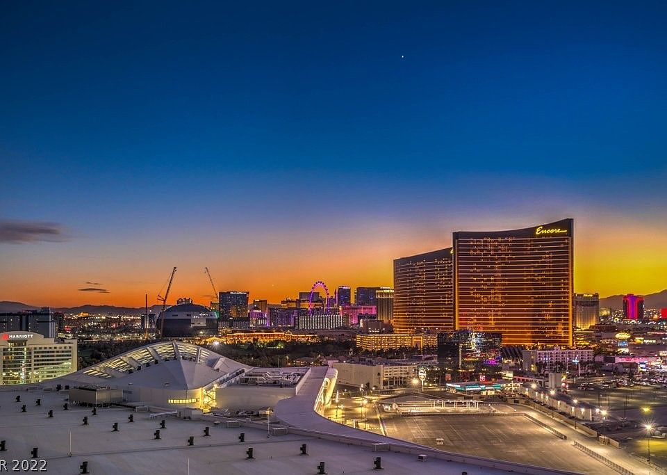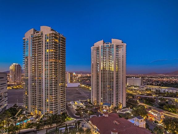Price Improvement Views, Views! This beautiful Custom floor plan in Guard Gated High-Rise overlooks the Las Vegas Strip, downtown, city, Wynn golf course, and mountain views. From your private elevator access enter the private foyer w/custom glass doors, large great room with fireplace and large terrace with access from the great room, and dining room with Strip Views. This unique 2805 sq ft has been modified to feature an extra-large Primary bedroom w/sitting area and amazing views and dual closets, could be converted back to 3 bedroom or den. Beautiful kitchen features high-end cabinetry, built-in refrigerator, wine cooler, floor to ceiling windows. Outstanding amenities to include a gym, pool, pet park, concierge, valet, limo service, meeting rooms, and guest suites. Additionally, a private membership to the Sterling club located within the property offers dining, fitness, spa, tennis, fitness plus much more. Two parking spaces included Conveniently located to the Las Vegas Strip