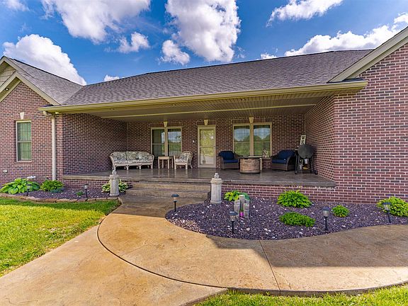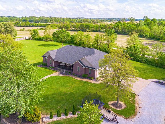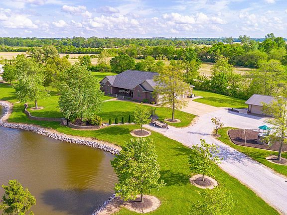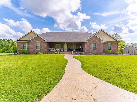 This stunning ranch home offers over 5 acres of scenic land with beautiful water views, a finished walkout basement for versatile living space, a detached garage for convenience, and additional features that make it a true slice of heaven. Ideally situated near Alcoa, Friedman Park, Newburgh, and numerous other attractions, this home offers convenience as well as comfort. Arriving along the long driveway, the home's setting welcomes you with a picturesque lake and lush greenery, creating a serene and inviting atmosphere. Entering through the oversized, covered front porch, the living room greets you with soaring ceilings, a cozy gas fireplace, and built-in bookshelves. Overlooking the living area, the kitchen features Amish cabinetry, granite countertops, a large island with bar seating, a walk-in pantry, and sleek stainless steel appliances, while the adjacent dining area provides easy access to the open deck. Down the hall, three of the four bedrooms are located, including the expansive owner’s suite, which features a walk-in closet with built-ins and an ensuite bathroom equipped with a freestanding bathtub, a tiled walk-in shower, and a twin sink vanity. The remaining main-floor bedrooms provide ample closet space and share a well-appointed hall bath. Completing the main floor are a convenient half bath and a spacious laundry room. The finished basement provides a spacious recreation area with a kitchenette, an additional bedroom with access to a full bath, and three oversized storage closets, offering versatile space for entertainment, guest accommodations, and ample storage to meet all your needs. Outside, you can enjoy the open deck and patio areas, perfect for outdoor entertaining. The attached four-car garage and detached two-car garage provide ample storage with custom shelving, ensuring space for vehicles, tools, and outdoor equipment. Relax during the cooler months by the built-in firepit, perfect for cozy gatherings, or enjoy the breathtaking scenery from the comfort of your inviting front porch. Once you arrive you'll never want to leave, making it the perfect sanctuary to call your own.