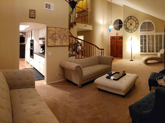 SOLAR panels means no electric bill and 220 volt outlet in garage included. Owner pays for pool service. Immaculate turn-key home sits atop of the cul-de-sac with a private yard with canyon views and no neighbors behind you. Perfect for outside entertaining with pool and built in grill. Large granite kitchen with center island white cabinets stainless steel appliances including Kitchen-Aid double convection oven/microwave combo. Cathedral ceilings in living room and dining area with plantation shutters. Oak parquet hardwood flooring flows from entry to large family room with fireplace, wet bar and into chef's kitchen and breakfast nook. One bedroom with full bath downstairs. Large upstairs landing with oak cabinets lead you to 3 bedrooms. Master bedroom with high ceilings sitting area, corner fireplace and multiple windows with canyon views. Walk-in closet contains built in cabinets and shelves. Upstairs bedrooms includes mirrored wardrobe doors with built-ins and Jack and Jill full bath between the two bedrooms. Newly installed maintenance-free artificial grass perfect for families. New AC unit. Dryer and fridge included. Owner pays for solar electricity and pool service. Tenant pays all utilities.
