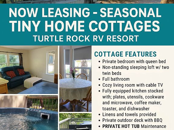 Welcome to Cottage 21 at Turtle Rock RV Resort in beautiful Gold Beach, Oregon. This fully furnished Tiny Home Cottage offers a private bedroom with a queen bed, a non-standing loft with twin beds, a full bathroom, and a cozy living room with cable TV. The kitchen is fully equipped with cookware, plates, utensils, and appliances, including a coffee maker, toaster, and dishwasher. Linens and towels are provided, with light cleaning and fresh replacements every two weeks. Enjoy your private deck with BBQ and hot tub, with maintenance included. All utilities (electricity, water, sewer, and WiFi) are included in rent. Amenities include an on-site gym, dog park, store, and the Arch Rock Brewery Tap Room. Dogs are welcome (2 max, no size limit) with a $350 fee per dog. Sign a 90-day lease before October 31, 2025, and receive a $750 credit toward your first month's rent! No deposit required.