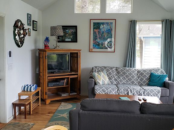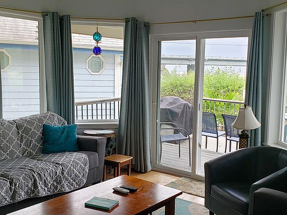 Tiny Home Living redefined. Fully furnished Park Model Cottage that has creek and ocean views from loft, dining area, living room, and deck. Loft has 2 beds for guests, and a queen-size bed in the bedroom. Full kitchen with electric fireplace for ambiance. Creek and ocean views from deck and sunken hot tub on deck. Make this your get-away or use it for additional income.