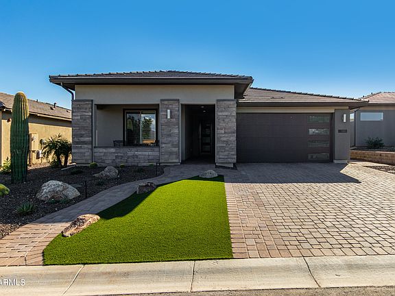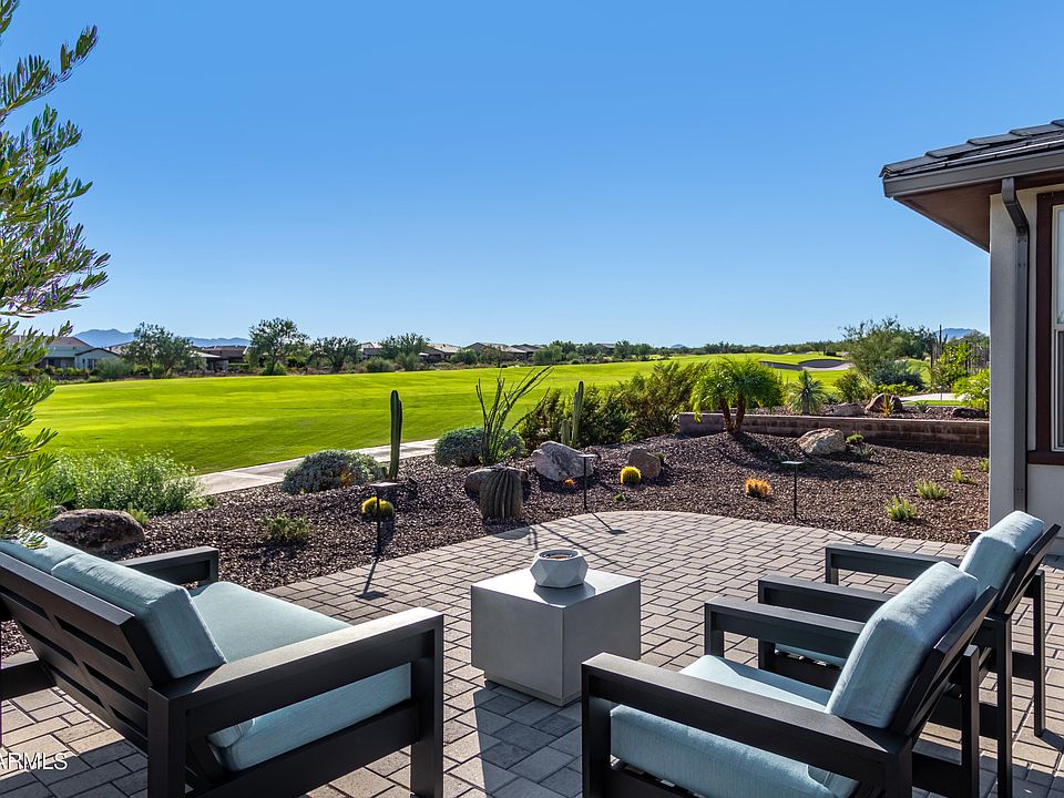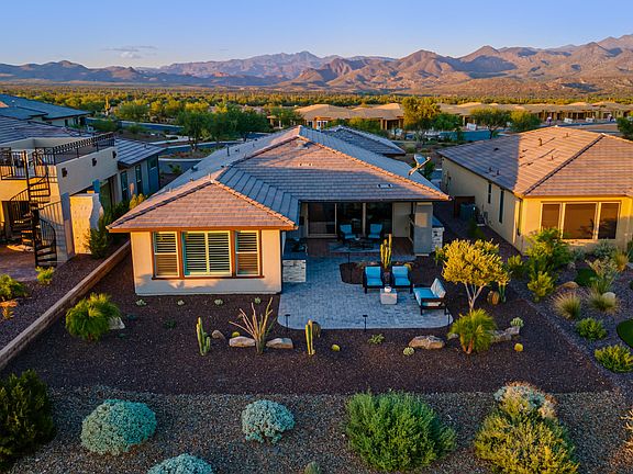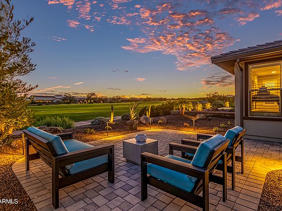 MOUNTAIN and GOLF COURSE VIEWS! Welcome to the life of LUXURY in beautiful Trilogy at Verde River! This stunning home is situated on the coveted 16TH HOLE offering gorgeous mountain views from the front and the back. The sophisticated interior boasts wood-look tile flooring, upscale ceiling fans/light fixtures, pre-wired surround sound, plantation shutters, and a den/office with double doors. Expanded sliding glass doors to the back patio bring the outdoors in. Elegant chef's kitchen exhibits ample cabinets with crown moulding and designer hardware, a walk-in pantry, SS appliances, granite counters, stylish tile. The grand main suite showcases a pristine ensuite with dual sinks, a designer tile shower and large walk-in closet. Enjoy stunning sunsets behind the mountains & a spectacular golf course view. Create lasting memories in the backyard comprised of a covered patio with an exterior fireplace, built-in grill and motorized sun shades and extended pavers.