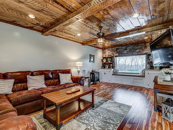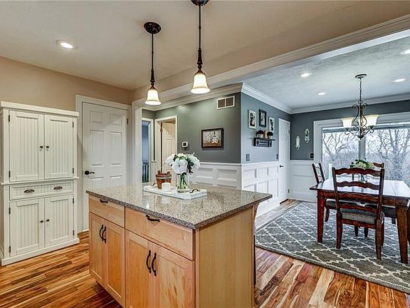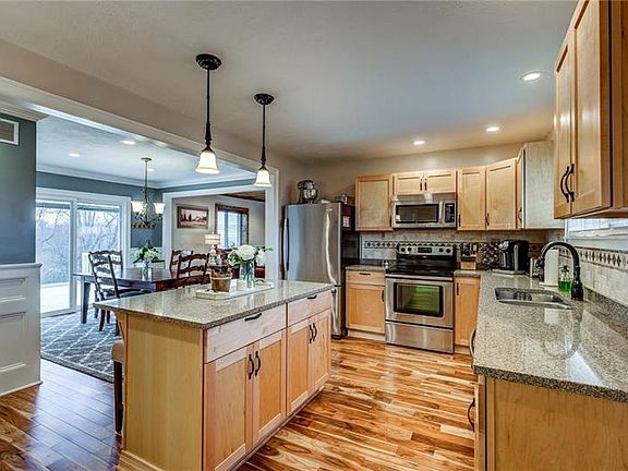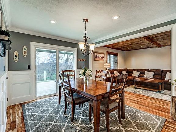 Beautiful & Spacious single level living! This home is much larger than it looks and is a must see! Completely custom updates throughout the entire home. Home features beautiful Acacia hardwood flooring and recessed lighting throughout. The kitchen and dining room are open and spacious, perfect for gathering with guests. Highlights of this kitchen are the Maple cabinets with custom trim, Quartz countertops, kitchen island with soft close drawers & SS appliances. The dining room features crown molding and custom wainscoting. Large living room includes ALL custom built-in storage with granite table tops, PA ledge stone and maple ceiling. Finished lower level with storage, newer carpeting and fireplace w/mantle. Enjoy the rolling hills and sunset views from the brand new 16x12 rear deck.
