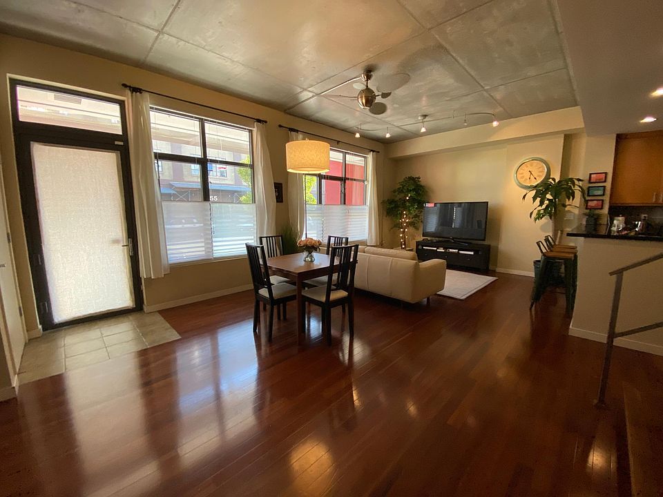 This Ground Floor corner unit lives more like an individual home than a condo. High concrete ceilings, tall windows, open floor plan, wood flooring, granite counter tops, in-home office space, two parking spaces (tandem), shared rooftop deck with bbq and much more. Entry on a raised walkway makes it easy to move in, bring in groceries and easily access all of the amenities that the neighborhood offers. Its location in the middle of Jack London allows for quick access to the Ferry, Bart, Freeways, craft coffee and beer, waterfront dining, farmer's market, etc. Initial 6 month lease, but can be flexible with a longer lease if desired. We are ideally looking for a tenant that would stay for the longer term (we lived in the unit for 8 years until we needed more space for our kids). Water and garbage included. Tenant pays for electric, gas and internet.