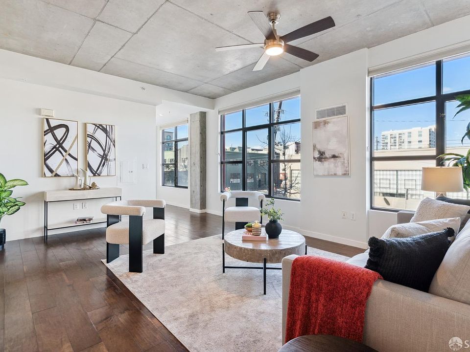 Stunning condominium home at 288 3rd St, a modern 2006 elevator building in the heart of vibrant Jack London Square. The unit features dramatic space, with two bedrooms two bathrooms, and a spacious open floor plan living & dining great room for grand scale entertaining. Walls of glass windows provide ample light throughout, and tall, exposed concrete ceilings make the space feel open and grand. The home includes in-unit laundry, one-car garage parking, bike parking, and deeded storage. The building features a welcoming lobby and an expansive rooftop garden with BBQ, dining area, lounge areas, heaters, and views over Oakland to San Francisco. This sought-after building is in the perfect Jack London Square location surrounded by shops, restaurants, breweries, hiking/walking trails, and water recreation plus easy access to BART, buses, 880 freeway, and San Francisco-bound ferry.