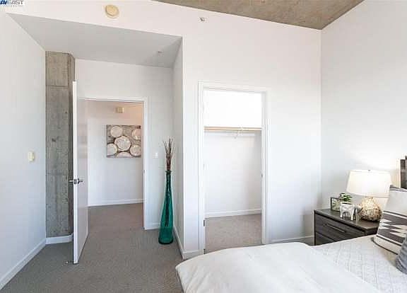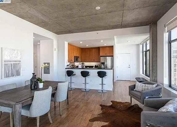 FIRST MONTH FREE! Beautiful top floor corner unit, 2 bed/2 bath in the heart of Jack London Square, tucked away from the train noise with easy freeway access and 2 garage parking spots. There are views of the water from the unit and wide-spanning views of Oakland, the Bay Bridge and the hills from the fully decked-out rooftop. I used to live in the building with my husband and toddler for several years and we absolutely love the building and the surrounding area. The building is walking distance to coffee shops, restaurants, and a beautiful wharf with lots of green space. The unit features a modern kitchen opening out to a light-filled spacious living area with large windows, with hardwood floors and concrete walls throughout the space. The carpet in the hallway and bedrooms was just updated. The master bedroom includes a large walk-in closet with a double sink vanity in the master bathroom. Brand new oven and new washer/dryer purchased within the last 2 years. A large storage unit and 2 garage parking spots are included. Jack London Square Pets permitted in the unit. Renter is responsible for gas, electricity and internet.
