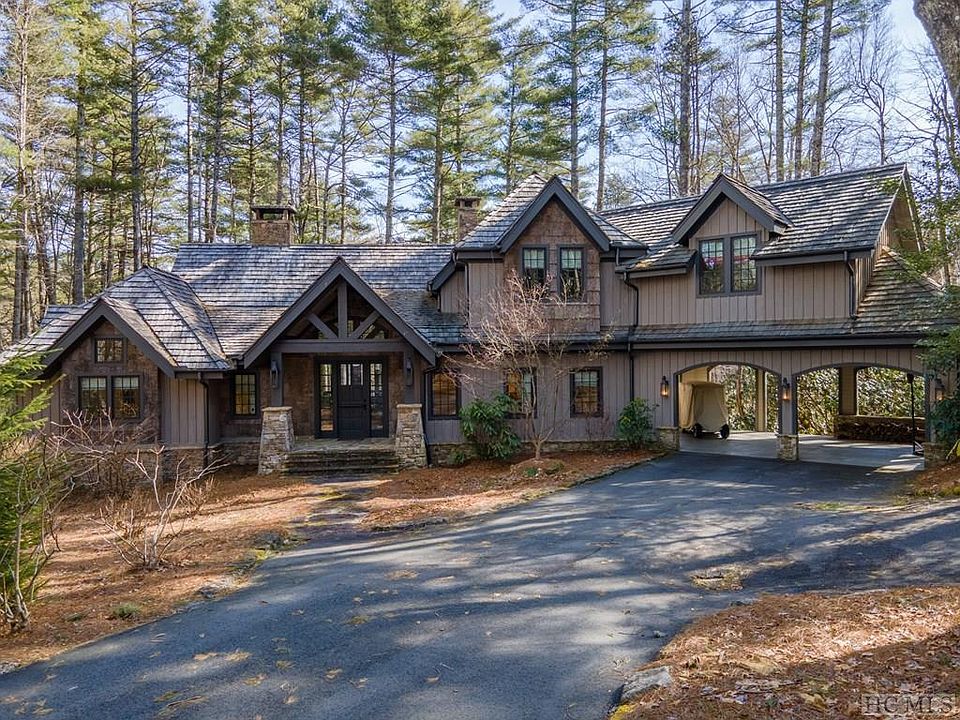 This sophisticated newer home is perched on a generous sized lot overlooking the Cherokee Campground park, and has a Chimneytop Mountain view. The location is ideal- in the heart of High Hampton and on the "original '' side of the neighborhood, it is within easy walking distance to the club and Inn. DesignSouth Builders and Kay Douglass Interiors rolled out their best to create this stunning 5BR/5BA/1HBA home with an open floor plan perfect for family and guests. Approaching the home from the paved circular driveway and slate covered patio, one is greeted by wood, stone and cedar shake exterior detailing, a dutch door and gas lanterns. Many interior walls are painted shiplap, hardwood floors are finished with muted warm grey tones, specialty lighting is featured throughout and unexpected pops of color punctuate each room. In addition to the great room, kitchen, laundry and cozy keeping room, the first floor features two bedrooms. The main bedroom with its own private deck and a bath with 2 vanities, 2 toilet rooms, soaking tub and shower is nicely separated from the rest of the home's "activity." A second bedroom is near the front door and has an en suite bath. Across the foyer is the powder room with "antique barn board" wallpaper. The sensitive site design of the house dictated a floor plan with an interesting angle best experienced when upstairs where there is a small loft "game room" and two traditional bedrooms with en suite baths. The final bedroom is set up as a fantastic four-sleeper bunk and tv room, also with a private bath. This lovely home has a kid and dog-friendly yard with a firepit. The trail to the top of Rock Mtn is nearby! Most furnishings are negotiable and may be purchased separately from the real estate.