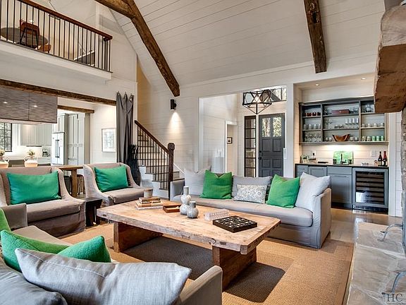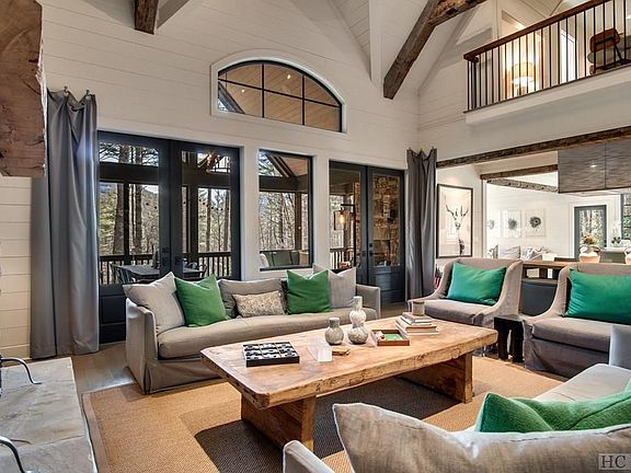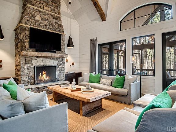 This sophisticated newer home is perched on a generous sized lot overlooking the Cherokee Campground park, and has a Rock Mountain view. The location is ideal- in the heart of High Hampton and on the "original '' side of the neighborhood, it is within easy walking distance to the club and Inn. DesignSouth Builders and Kay Douglass Interiors rolled out their best to create this stunning 5BR/5BA/1HBA home with an open floor plan perfect for family and guests. Approaching the home from the paved circular driveway and slate covered patio, one is greeted by wood, stone and cedar shake exterior detailing, a dutch door and gas lanterns. Many interior walls are painted shiplap, hardwood floors are finished with muted warm grey tones, specialty lighting is featured throughout and unexpected pops of color punctuate each room. In addition to the great room, kitchen, laundry and cozy keeping room, the first floor features two bedrooms. The main bedroom with its own private deck and a bath with 2 vanities, 2 toilet rooms, soaking tub and shower is nicely separated from the rest of the home's "activity." A second bedroom is near the front door and has an en suite bath. Across the foyer is the powder room with "antique barn board" wallpaper. The sensitive site design of the house dictated a floor plan with an interesting angle best experienced when upstairs where there is a small loft "game room" and two traditional bedrooms with en suite baths. The final bedroom is set up as a fantastic four-sleeper bunk and tv room, also with a private bath. This lovely home has a kid and dog-friendly yard with a firepit. The trail to the top of Rock Mtn is nearby!