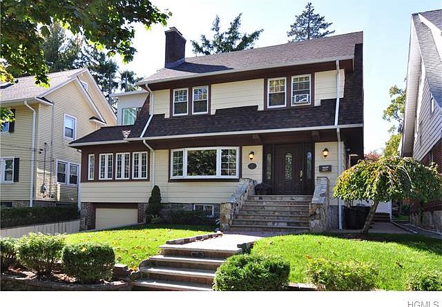 Beautifully renovated four bedroom colonial. Entry foyer with stone floors. Sun drenched living room with picturesque bay window, decorative molding and brick fireplace. Fabulous sunroom that has an abundance of windows. Spacious kitchen appointed with maple cabinetry, granite counters, stainless steel appliances and door to enormous stone patio that's great for entertaining. Updated half bath off kitchen. Open spacious dining room. Second floor boasts three bedrooms and renovated full bath with Jacuzzi, shower and marble floors. Third floor boasts one bedroom plus bonus room and full bath. Refinished gleaming hardwood floors throughout. Level fenced-in backyard. Attached garage. Close proximity to Schools and Metro North train. Be the proud owner!