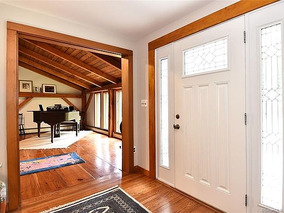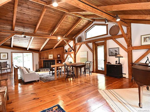 One of a kind home on serene, private waterfront setting on Five Mile River with beautiful views of Florsheim Pond. This unique home features a harmonious blend of the character of the 1920s, the practicality of the 1950s, and the warmth of post and beam construction of the 1980s. The tastefully remodeled interior showcases dramatic cathedral/vaulted ceilings with exposed beams, expansive use of glass, 3 fireplaces, gleaming wide board wood floors, custom kitchen with granite tops, cherry cabinetry and stainless appliances, private master suite with exterior access that can also be used as a home office, large laundry room, three season porch, and spacious deck overlooking the woods and tranquil pond, full of fascinating wildlife activity. Additionally, there is a three-story barn, complete with sliding barn doors, large loft, and finished living space on lower level. Warmth and comfort abound in this very special home on Darien/New Canaan borders Barn is large...perfect for contractor, etc. Fireplace in den is "as is", needs liner. Apartment on lower level of barn is not legal. Main house is on septic, barn apartment is on cesspool. Central Air is on main level of home, Lower level bedroom has commercial in wall unit, Family Room on lower level has wall unit a/c. Small portion of property where it borders river is in flood zone. House is not in flood zone. See survey on "supplements" for lot lines. Shared portion of driveway: expenses shared with neighbor. No formal agreement.