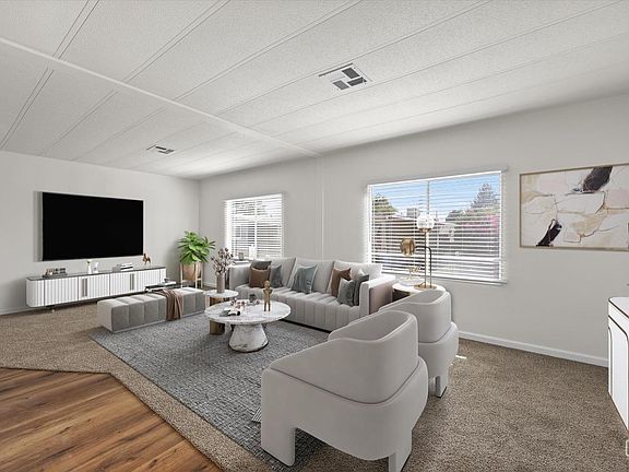 Step into this exquisitely renovated 1,440 sq ft manufactured home in Riverdale Village, boasting 3 bedrooms, 2 bathrooms, all poised for a new home owner. The entrance welcomes you in to the charming dining / living area, setting the tone for a home filled with upgrades including a newer roof and HVAC unit. Inside, find new stainless steel appliances at the kitchen and updated built-in cabinetry enhancing the home's style. The home features a newly revamped laundry room, adding to the convenience. Luxury touches include new carpet, wood-like flooring, fixtures, and a fresh coat of paint inside and out. Bathrooms shine with fresh showers, underpinned by plentiful natural light throughout. Enjoy the plethora of park amenities including: a sparkling pool, billiards & game center, well-equipped clubhouse kitchen, recreational room, gym, soccer and basketball courts, playground, and dog station, all designed to enrich your living experience.