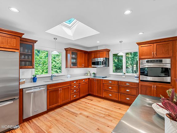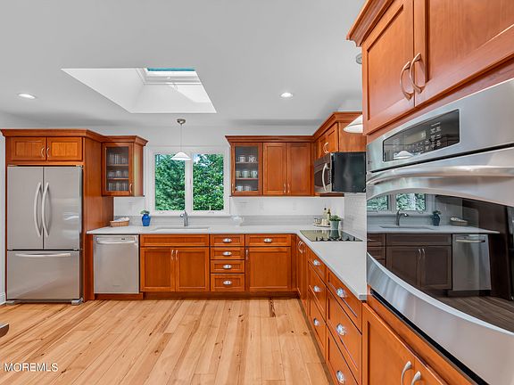 Tucked away on scenic Ocean Blvd this 4 bedroom, 2.5 bath raised ranch home has been lovingly updated and immaculately maintained. With captivating Winter water views you can watch the sailboats moored in the harbor, on one of two full decks. Huge finished walk-out basement features a den with fireplace, and family room/office, all with sliders to enjoy the tranquil outdoor space. Oversized garage, Kohler generator, brand new TimberTech decking and stairs, hardwood floors, quartz countertops and skylights. The ranch style is ideal for easy accessibility and the winter water views are priceless. Close to parks, beaches, trails, the ferry and bus. This is a rare opportunity to live on top of the hill in Atlantic Highlands that you don't want to miss!