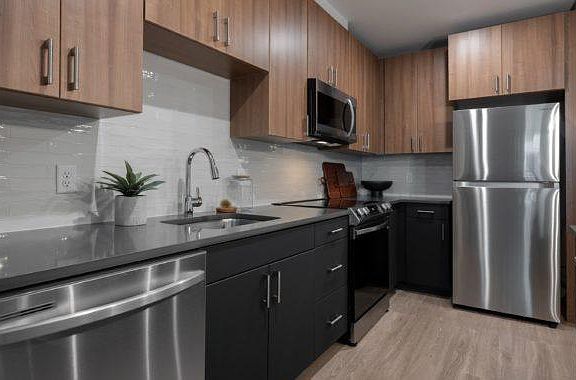 Chef's kitchen with quartz countertops, white-tile backsplashes, pendant lighting and Samsung stainless steel appliance package Wide plank flooring Elegant bathrooms with quartz countertops, tub/shower surrounds, LED-backlit mirrors Schlage Control smart locks Full-size Samsung washer and dryer Sun-blocking roller shades Spacious walk-in closets