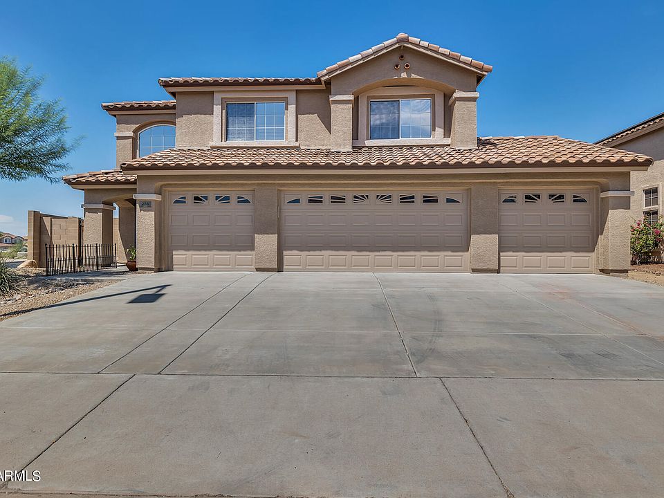 This barely lived-in vacation home is a rare find indeed! Situated on a 10,692 sq. ft. corner lot across the street from a neighborhood park and backing up to a natural wash in the Sundance golf community in Buckeye, it meets all the criteria for location, location, location! The home combines features and flexibility that you can customize to suit your lifestyle. New roof and newly completed professional exterior paint project. The fully equipped 4-car garage can accommodate your vehicles, toys, workshop, workout, etc. The formal living room features a dramatic 2-story ceiling. The formal dining room connects to both the kitchen and living room. The family room, open to kitchen, provides access to full-length 10x38 patio. Back yard landscape omitted for your creative pleasure. Kitchen features include raised panel cabinets, island, plentiful counters & refrigerator. Primary suite, secondary bedrooms, full bath & den. Primary suite overlooks back yard & includes double door entry, separate tub/shower, double sinks & walk-in closet. Den overlooks formal living area. Flexibility in floor plan allows conversion of spaces to your taste. Many more features to see when touring the home