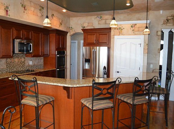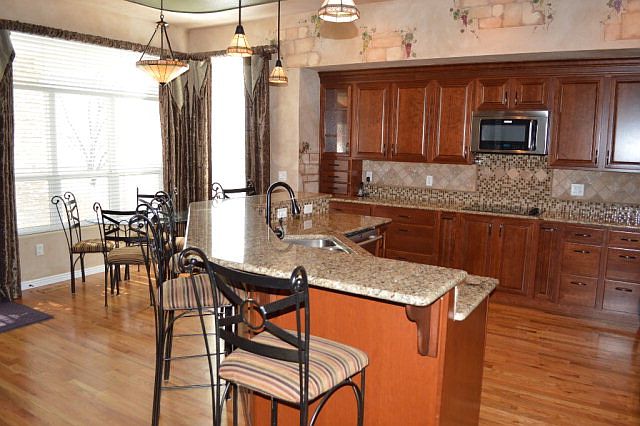 This is a BEAUTIFUL home! Great attention to detail noted throughout. Open floor plan with gorgeous cherrywood kitchen cabinetry, stainless appliances & island with tiffany-style pendant lighting. Informal and formal dining areas - all with wood flooring. Split bedroom design. Large main level laundry. Basement family room has wet bar including microwave, dishwasher & full size refrigerator. The bath is set up for children with separate tub area/double sinks. A gaslog fireplace on each level. Outside is a childrens & entertainers paradise. Large covered patio with speakers, built-in BBQ with granite top & decor stacked rock, beautiful waterfall/pond feature, sports slab & 12X16 storage shed. Vinyl fencing frames it all beautifully!