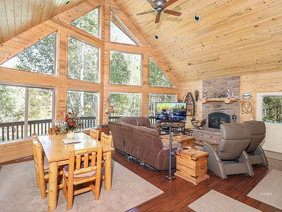 Take advantage of this rare opportunity to own a custom cabin in Elk Ridge Estates Unit 1. Showcasing lush views of shimmering aspen trees through marvelous oak framed floor-to-ceiling pictured windows, this cabin captures the beauty of Southern Utah. The rustic yet refined 3 level cabin invites all who enter. On the main level, an open floor plan expands to a large living room with soaring vaulted ceilings, hardwood floors, a dining area equipped to entertain a large host, a dedicated main level laundry room, and a kitchen built to satisfy a chef. The kitchen includes a center island w/ a built-in wine rack, stainless steel appliances, granite counters, & custom solid wood cabinets. Retreat to the upper-level master suite after a day of adventure. Attached is a comfortable master bath with a walk-in tiled shower, dual sink, & jetted tub. The lower level encompasses a delightful living area with its own full-service wet bar, a 3/4 bath, & 2 bedrooms. Located on the South edge of the .6 acre corner parcel is a 2 level garage/studio built to accommodate. The upper-level studio features a living area, kitchen, 3/4 bath, and sleeping area. Seasonal Aspen Hollow Bed and Breakfast.