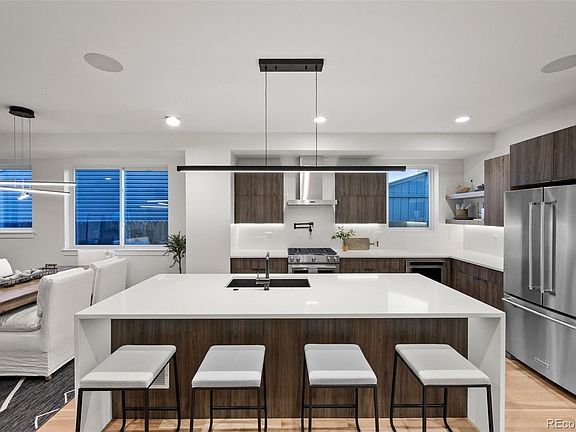 Bold. Modern. Cool. 4 bed/4 bath new construction 1/2 duplex in super hot south Broadway unlike anything SoBo has seen yet. Luxury custom finishes & details throughout. Thoughtful design. Higher quality custom finishes. Modern aesthetic. Designer details & upgrades. Kitchen w/soft-close cabinetry by Showplace, eat-in waterfall island, huge pantry, champagne bronze faucet & pot filler, under cab + under-island lighting, custom oak shelving, $900 71" linear LED suspension light, in-ceiling speakers & deluxe Kitchen Aid appliances incl convection gas range & $1600 top-loading drawer-style microwave. Huge living room w/linear gas fireplace, designer tile (from Spain) surround, 12 ft Marvin Integrity (wood interior/composite exterior) sliding door. Huge master w/hardwoods, 12'8" tall vaulted ceilings, walk-in closet, custom oak shelves, ultra-quiet Modern Forms smart fan (integrates w/smart devices) & in ceiling speakers. Huge ensuite master bath w/ vaulted ceilings, soaker tub, huge double shower & Porcelanosa tile from Spain. Andersen fibrex composite windows (2x the strength of vinyl). Hardwoods also in hallway. Custom abstract iron railings & monorail staircase w/floating wood treads. Home office w/custom glass office door, oak shelving & tons of natural light. Finished basement w/big rec room. 2 beds upstairs w/vaulted ceilings. 4th bedroom in basement w/huge walk in closet. Switched patio outlet in soffit for party lights. Pre-wired for audio in living room (5.1 surround), basement (7.1 surround), master bedroom (ceiling speakers installed), kitchen (ceiling speakers installed) w/receiver included. Central networking panel. LED lighting in entire home for energy efficiency. High efficiency furnace & H20 heater. Nest thermostat. Central A/C. Custom stainless mailbox & address #s. 2 car garage w/wifi/smart opener. Large private back yard w/patio. No HOA. Buyer to verify sq ft & taxes (not yet assessed). Most photos are of adjacent unit.