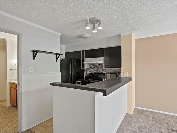 • Description: Ss Sink, Formica Counter Top, Glass Tile Backsplash, Tile Floors, Breakfast Bar, Black Appliances, Shelving.
