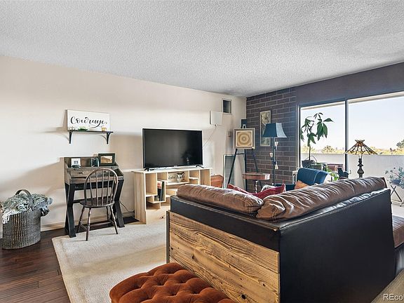 Nestled on the sixth floor with enviable outdoor connectivity and treetop views, this home shines with comfort and livability. An open-concept floorplan creates a seamless transition between the dining and living rooms, the latter of which offers access to the spacious balcony through sliding glass doors. Nearby, an updated kitchen showcases butcher block counters, stainless steel appliances and a stylish color palette that emboldens the exposed brick. An en-suite bedroom offers natural light and ample space to relax. The dual-entry bathroom features modern fixtures and a separate washroom for added flexibility. Residency in this building grants access to curated common areas, a fitness center, indoor/outdoor pool and spa, a community room and a game room. The secure building features common laundry facilities on each floor while the HOA includes A/C and heat. Storage unit included in first floor secured room. Plentiful open parking in surface lots. Easy access to I-25 and the Yale Light Rail Station grants residents easy access to all the shopping, dining and parks that SE Denver has to offer.